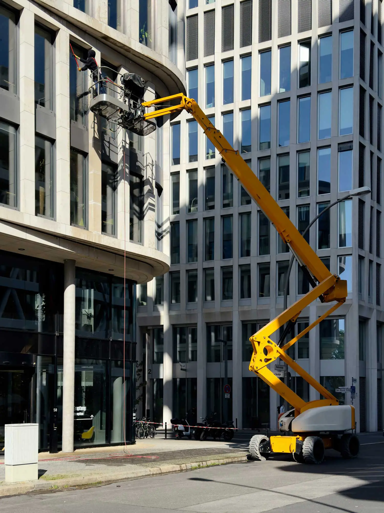 - Glasreinigung in großer Höhe mit Hebebühne